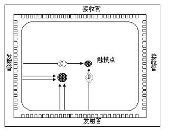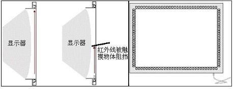 紅外觸摸屏是在緊貼屏幕前密布X、Y方向上的紅外線矩陣,通過不停的掃描是否有紅外線被物體阻擋檢測并定位用戶的觸摸。如下圖所示,這種觸摸屏是在顯示器的前面安裝一個(gè)外框,外框里設(shè)計(jì)有電路板,從而在屏幕四邊排布紅外發(fā)射管和紅外接收管,一一對應(yīng)形成橫豎交叉的紅外線矩陣。每掃描完一圈,如果所有的紅外對管通達(dá),綠燈亮,表示一切正常。