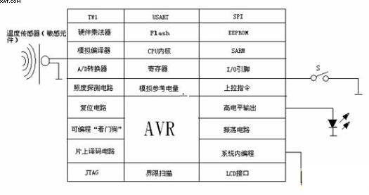 占有傳感器實質上是一種智能式的微控制器,主要有敏感元件、微處理器、信號接收與處理電路、開關及發光LED等部分組成。其中微處理器或稱作微控制器是采用美國Atmel公司生產的低電壓、高性能的AVR 8-bit RISC微控制器,又稱作Atmega88。此微控制器屬于片上型微處理器,以CIP-51為內核,它本身集成了許多外圍設備,如A/D和D/A轉換器、1kB 的SRAM、可編程的8kB的 FLASH存儲器、512字節的EEPROM、一個內部RC振蕩器等。所有的I/O端口的每一個引腳都置上拉電阻,根據要求可獨立地通與斷。片上定時器/計數器具有定時、捕獲、比較和PWM輸出等功能。Atmega88結構框圖如圖1所示。