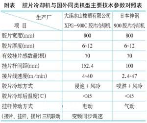 膠片冷卻機與密煉機、壓片機配套使用。將密煉機煉好的塑煉膠或混煉膠,經壓片后,膠片進入該機進行浸泡,涂隔離劑后進入掛桿,經冷卻干燥,最后進行連續疊片。這種膠片冷卻機是集日本、英國、臺灣等廠家的長處為一體,增加自主創新抓膠片的機械手部分,傳動裝置全部采用日本富士交流變頻器,實現抓膠片自動化、傳動調速同步化的自動控制系統。膠片冷卻機與國外同類機型主要技術參數對照表如附表所示。