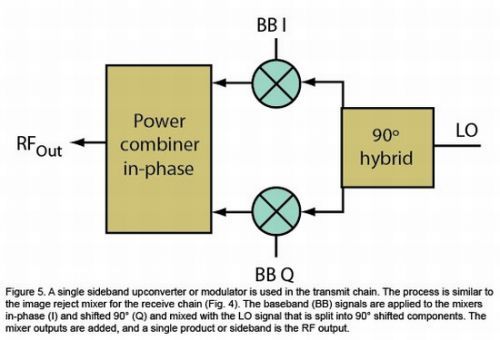 圖4:鏡像抑制混頻器在接收器中最受歡迎。它可以通過相移去掉和頻或差頻產(chǎn)物,產(chǎn)生單個輸出,而不需要濾波。LO進行90°相移,產(chǎn)生同相和正交相位信號,與輸入的RF信號進行混頻。然后混頻器輸出互相進行90°相移,從而去掉部分產(chǎn)物。