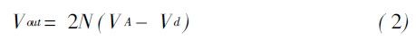 RFin正半周期時,節點1的最大電壓為VA+(VA-Vd)。該電壓使得M1導通,C2充電,直到C2兩端達到最大電壓,即節點2的最大電壓,為VA+(VA- Vd)-Vd=2(VA-Vd)。依次類推,C3兩端能夠獲得的最大電壓為3(VA-Vd),節點4的最大電壓為4(VA-Vd)。節點2N的最大電壓為 2N(VA-Vd)。于是,對于2N級電路,輸出直流電壓為: