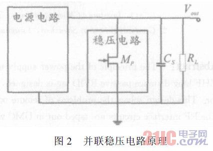 通常的并聯式穩壓結構如圖2所示。當Vout大于穩壓電路開啟閾值時,穩壓電路內的瀉流管Mp開啟,從瀉流管瀉放電流,使電壓降低。