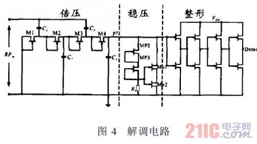 近年來,915MHz以及2.45GHz等UHF波段的射頻標簽由于工作距離遠,天線尺寸小等優點越來越受到重視。射頻標簽芯片的射頻接口模塊包括電源恢復電路、穩壓電路和解調整形電路。射頻接口的設計直接影響到射頻標簽的關鍵性能指標。