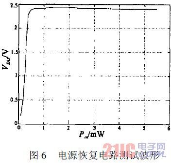 電路帶200k負載,300pF儲能電容。輸入功率229W時,電源電壓到達1.85V。穩壓電路工作良好,電源電壓穩定在2.3V。
