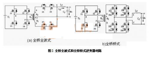 根據高頻逆變器(推挽式、半橋式、全橋式)、周波變換器(全波式、橋式)的組合不同,高頻脈沖交流環節逆變器具有6種電路拓撲,其中全橋全波式、全橋橋式電路如圖2所示。