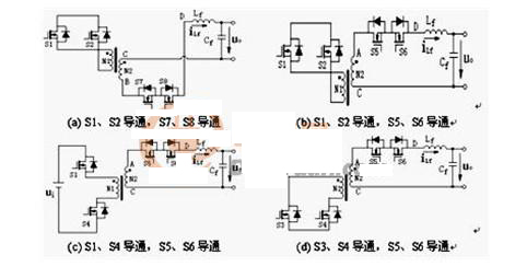 讓周波變換器的功率開關S5與S7(S6與S8)之間存在換流重疊導通時間、S5與S6(S7與S8)按濾波電感電流iLf極性選擇導通,從而使得該控制方案具有如下優點:1、周波變換器換流重疊期間實現了變壓器漏感能量的自然換流,實現了功率器件的零電流開關;2、實現了濾波電感電流的自然續流;3、iLf極性選擇信號的引入避免了換流重疊期間周波變換器中的環流現象;4、每個開關周期內兩次交流側的能量回饋實現了逆變橋所有功率器件的零電壓開通[5]。