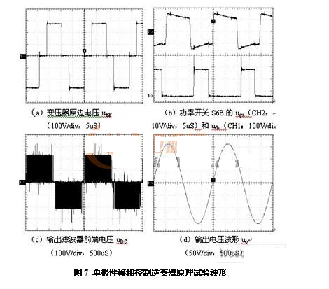 實現單極性移相控制的方案為:1、將輸出電壓反饋信號uof與正弦基準電壓uref比較放大后得到電壓誤差放大信號ue1,ue1與載波uc比較后得到信號k1,k1下降沿二分頻、反相互補后分別得到功率開關S1、S3的驅動信號;2、將ue1反極性信號ue2與載波uc比較后得到信號k2,k2下降沿二分頻、反相互補后分別得到功率開關S2、S4的驅動信號;3、將載波uc下降沿二分頻、反相互補后分別得到功率開關S5(S6)、S7(S8)的驅動信號。