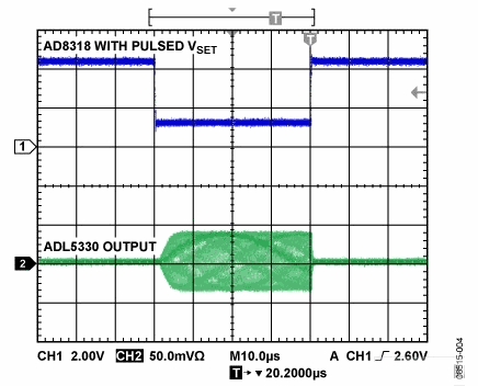 圖4顯示AGC RF輸出對(duì)VSET脈沖的響應(yīng)。當(dāng)VSET降至1 V時(shí),AGC環(huán)路以RF突發(fā)脈沖予以響應(yīng)。響應(yīng)時(shí)間和信號(hào)積分量由AD8318 CFLT引腳上的電容控制,這與積分放大器周圍的反饋電容類似。電容增加將導(dǎo)致響應(yīng)速度變慢。
