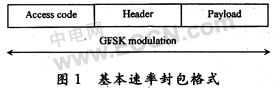 藍牙v1.2基帶數據封包中包含了存取碼、標頭、保護時段(guard band)和負載(payload),如圖1所示?;舅俾收{變指的是GFSK,數據會以每個符號攜帶一個位元的方式,在1 Mb/s的資料速率下進行傳輸,因此符號速率為1 Ms/s。資料會利用最小115 kHz的載波頻率中的位移或偏差,在RF載波上調變。高斯脈沖波形將-20 dB的頻寬維持1 MHz,頻譜利用率比BFSK高一倍。