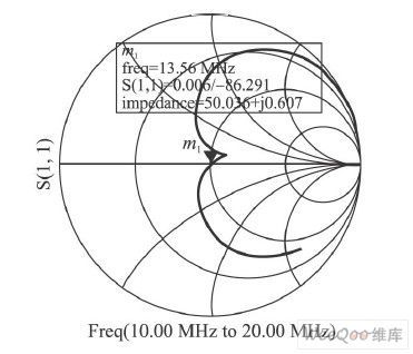 在載波頻率為13. 56 MHz時,通過在TX1 和TX2 兩點測量天線線路的反射系數(即參數S11 )來手動調諧,直到天線電路的輸入阻抗達到目標,計算方程如下: