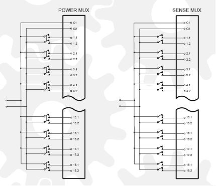 電源和手機之間的距離一般為幾米,因此就會很難將手機中的電池的性能很好地發揮。采用配有遙感接口的快速反應電源就可以解決這個問題,該遙感即可調節的是手機上的電壓,而不是電源的輸出端的電壓。需要四根線路來實現這個功能,兩條電源連接線,兩條傳感連接線。這些連接線需要能夠相互轉換,這樣就可以將它們同選定的手機進行連接。這些多路復用器中的兩個可以用來轉換36個手機中的信號。在電源的兩端進行電源切換,這樣就可以保證電纜的故障不會造成地面電流流向測試系統。