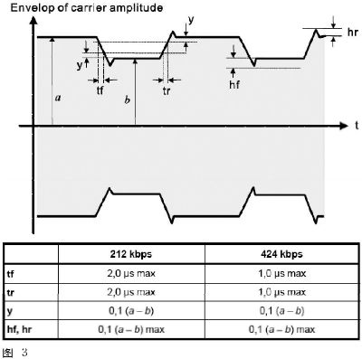 由于NFC106kbps為100%ASK調(diào)變,所以對整個High/Low信號的封包結(jié)構(gòu)都有相當詳細的定義。其中幾個參數(shù)包括從100%下降到5%Am時間(t1)、5%Am持續(xù)時間(t2)、Am由5%上升至60%時間(t4)即overshoot的范圍。而212/424kbps則是8%~30%的調(diào)變率。