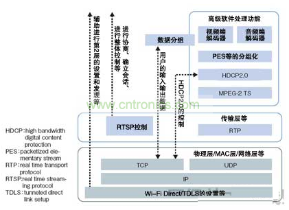 Wi-Fi Display是以無需經由WLAN接入點即可在終端間直接通信的標準“Wi-Fi Direct”為基礎,由上層的協議棧軟件構成的安裝指南。鎖定終端服務的“服務發現(Service Discovery)”等的處理利用Wi-Fi Direct進行,影像的壓縮/解壓處理及管理數據流的傳輸層等利用Wi-Fi Display處理(圖2)。壓縮/解壓采用H.264格式。由于最近的智能手機不但標配WLAN功能,采用內置H.264編解碼器電路GPU的終端也很多,因此Wi-Fi Display還具有易于配備到終端中的特點。“在受限于安裝面積和耗電量的智能手機中,無需追加硬件即可配備的優勢非常大”(Cavium公司的柴田)。