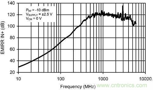 EMIRR曲線展示了運放被傳導的抗RF信號(該信號被應用到非反相輸入端)干擾能力的測定值。術語“被傳導”是指該RF信號被直接應用到使用阻抗匹配型印刷電路板(PCB)的運放輸入端。此外,還對放大器輸入端的反射進行了表征和說明。