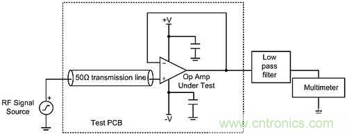 最后,用數字萬用表測量由RF信號產生的DC偏移電壓。請注意,在放大器和萬用表之間使用了低通濾波器,以防止由穿過放大器的殘余RF信號引起的潛在錯誤。圖2展示了用于表征EMIRR的測試電路。