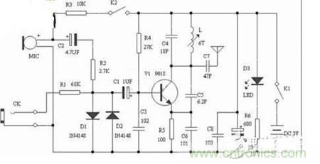 【導(dǎo)讀】FM調(diào)頻發(fā)射機(jī),發(fā)射頻率在模擬廣播波段88~108Mhz,用普通FM收音機(jī)接收,2種音信輸入,MIC頭將周邊聲音發(fā)送,CK音信輸入,調(diào)校可調(diào)發(fā)射線圈L可改變(微調(diào))發(fā)射頻率。
