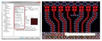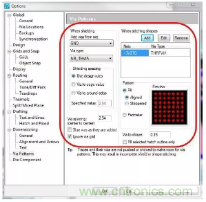 射頻設計的另一個重要方面是確保正確地利用vias屏蔽特定的區域。盡管此任務可由設計人員手動進行,但這個過程極其耗時。如果PCB設計工具能夠自動完成此過程,將可以縮短設計周期時間并確保符合您的所有設計規則。利用此類工具,設計人員可以指定via模式產生特定規則,而將剩余的工作全部交由PCB設計工具完成。