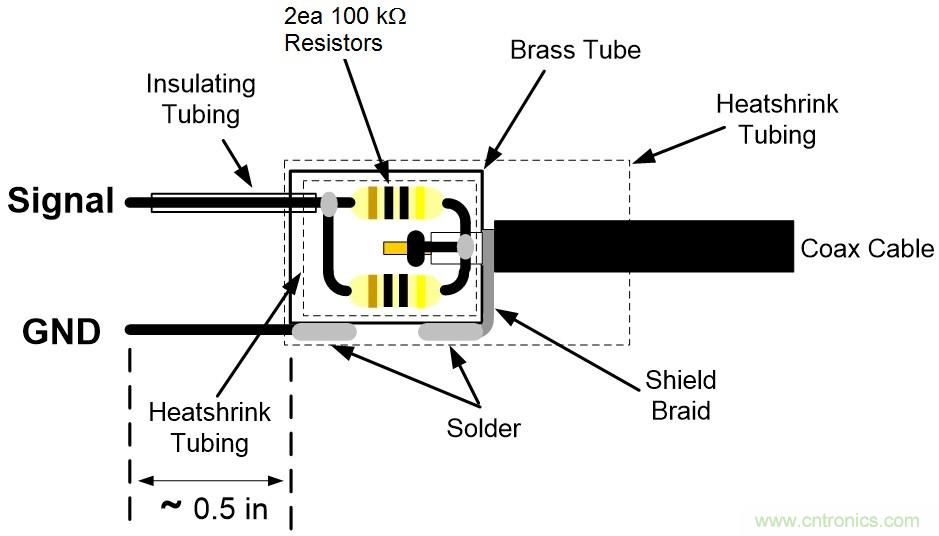 圖1:1000:1、 50Ω電壓探頭使用兩個100kΩ電阻并聯,比使用單個50kΩ電阻的功率耗散能力增加了一倍。