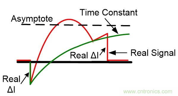 圖6顯示了如果在目標電路同一位置的電流檢測電阻上查看,實際信號是如何按預期出現的。盡管內心里想以任何精度從顯示信號中減去時間常數,但這在數學上不切實際。因此,關于顯示可信度的陳述與電流轉換相去甚遠。當然,也可以花大價錢買一個磁性“DC”電流探頭幫你做上述數學計算,但是帶寬太低。