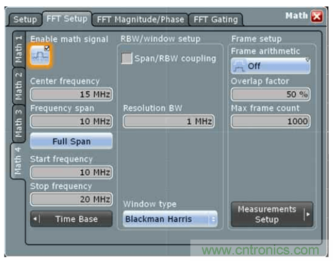 以前的示波器操控方式,無非是通過調(diào)整采集時(shí)間的長度來影響分辨率帶寬,然后選擇感興趣的頻段來進(jìn)行觀察。現(xiàn)在做法是先選擇中心頻率,或者選擇好起始和截止頻率,通過直接調(diào)整RBW 來調(diào)整頻譜觀察方式,讓習(xí)慣頻譜儀的用戶也習(xí)慣示波器了。