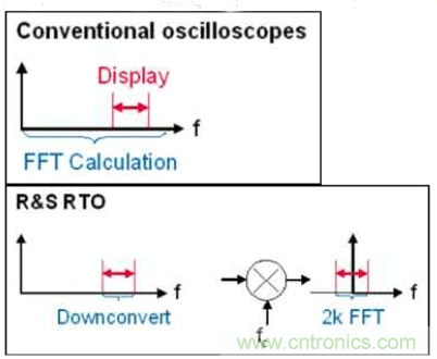 傳統(tǒng)的做法是,示波器把信號樣本采集下來,然后通過軟件算法來進(jìn)行軟件運(yùn)算,速度非常慢,我們的方式通過專用的硬件加速集成電路(ASIC),把fft 功能交給這個(gè)硬件電路來實(shí)現(xiàn),速度快到幾乎不影響原始波形的刷新速率。當(dāng)然這個(gè)ASI 是需要花大把銀子來研發(fā)的。核心對比用到了專用的DDC 電路。