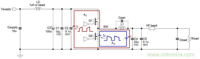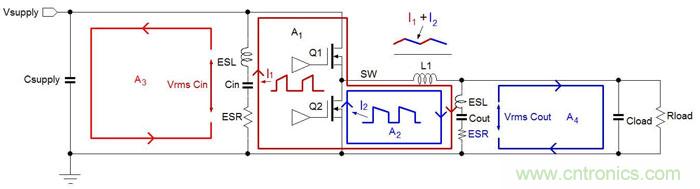 Buck架構DC/DC轉換器中存在兩個電流發生劇烈變化的主回路 :