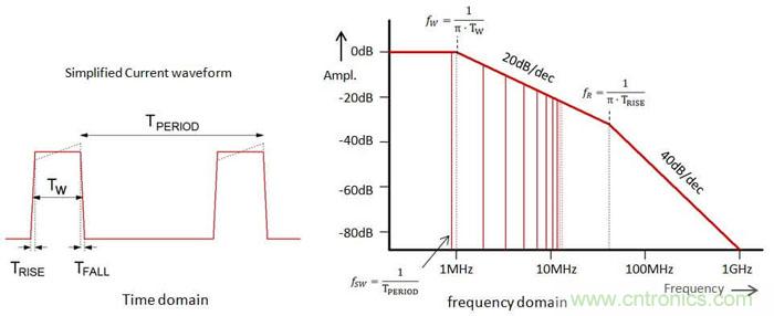 為了理解這能導致多大程度的改進,我們需要對不連續電流脈沖的高頻成分進行一番探討。圖6左側顯示的是簡化為梯形了的電流波形,其周期為TPERIOD,脈沖寬度為TW,脈沖上升/下降時間為TRISE。從頻域來看此信號,其中含有基頻成分和很多高次諧波成分,通過傅里葉分析可以知道這些高頻成分的幅度和脈沖寬度、上升/下降時間之間的關系,這種關系被表現在圖6的右側。