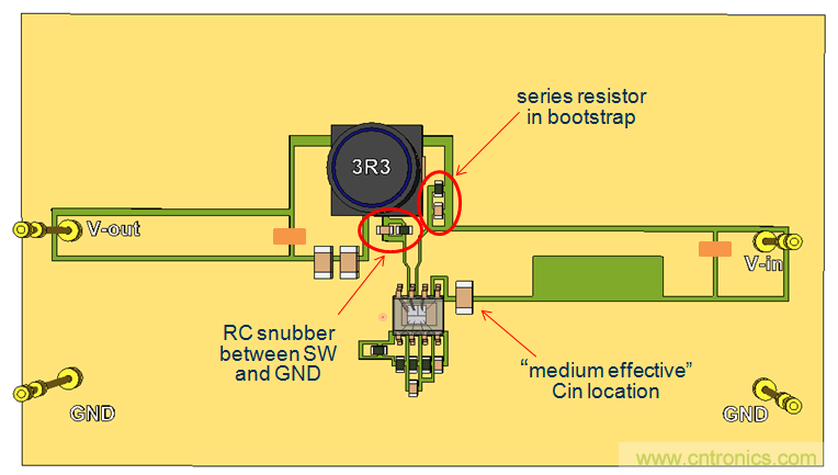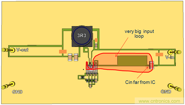 我們繼續使用單面PCB,并將CIN放置到靠近IC的地方,這樣就形成了比較小的CIN回路。參見圖20。