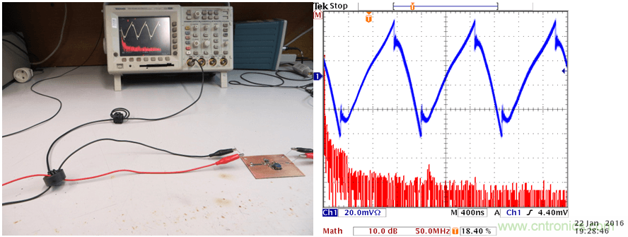 從圖17右側顯示的波形可以看到,共模電流是出奇地大,而且在很寬的整個頻段上都可看到。