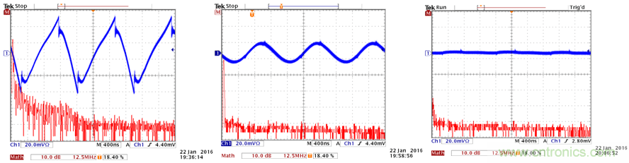 正如從圖29中看到的那樣,添加磁珠 + 電容構成的濾波器可濾除除800kHz基波以外的所有高頻成分,添加1µH電感 + 電容構成的濾波器可消除包含基波在內的所有差模噪聲。