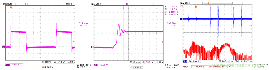 開關切換波形顯示出5V的過沖,過沖信號的振蕩頻率為238MHz;輸入線上的共模電流顯示出明顯的高頻噪聲。參考圖33。