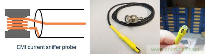 另外一種手持式的工具是電流探測器,這是一種使用開放式鐵芯的小型化電流變壓器,參見圖46。這種工具可用于測量銅箔路徑或元件引腳上的高頻電流。