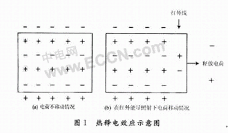 某些強介電物質(PZT,LiTaO3等)的表面接受了紅外線的輻射能量,其表面產生溫度變化,隨著溫度的上升或下降,這些物質表面上就會產生電荷的變化,這種現象稱為熱釋電效應。圖1為晶體表面電荷隨溫度變化的移動情況[1]。