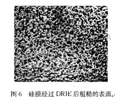 反應離子深刻蝕(DRIE)能刻出非常深的垂直結構,本試驗用于最后硅薄膜的形成。DRIE的刻蝕效果(刻深為250 μm)沒有KOH腐蝕的平坦,刻蝕表面比較粗糙,表面顆粒起伏為幾個微米,如圖6。此外刻蝕存在不均勻性,75 mm硅片四周已經刻到電極露出,而硅片中央的電極還沒有露出。深刻蝕的不均勻性與刻蝕表面的圖形有著密切的聯系,但其中的成因和機理目前還沒有具體合理的理論和解釋說明。因而無法從理論上指導規劃刻蝕表面的形狀設計,更多的是依靠經驗手動凋整。