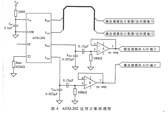 汽車防盜中,車體傾斜角度的測(cè)量要求其信號(hào)的噪聲必須很小,這就要限制信號(hào)帶寬。而對(duì)于振動(dòng)的測(cè)量,則需要10~200Hz的較寬信號(hào)范圍。首先,將XFILY、YFILT引腳的濾波電容CX、CY設(shè)定為0.027μF,這樣輸出的數(shù)字、模擬信號(hào)的帶寬全都限制在200Hz以下,再將ADXl202輸出的帶寬為200Hz的數(shù)字和模擬信號(hào)分別經(jīng)過低通濾波和高通濾波,就可以獲得傾斜、振動(dòng)監(jiān)測(cè)所需帶寬的信號(hào)。將ADXL202同時(shí)作為振動(dòng)測(cè)量和傾角測(cè)量傳感器的方案原理圖如圖4所示。