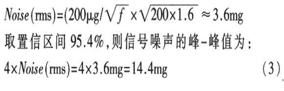 傾斜角度測(cè)量值通過XOUT、YOUT端口輸出的數(shù)字信號(hào)得到。由于經(jīng)XFILT、YFILT端口的電容低通濾波,信號(hào)帶寬為200Hz.則根據(jù)ADXl202的噪聲計(jì)算公式為: