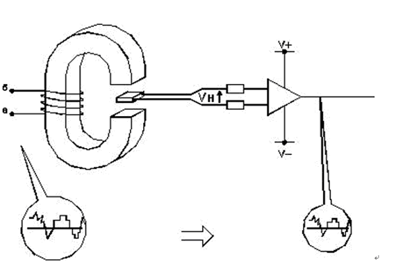 圖1.位于磁性電路間隙中的霍爾發生器把一次電流產生的磁場轉換成成比例的霍爾電壓。