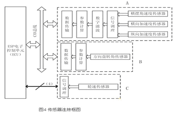 本文所作設計的框圖如圖4所示。在圖中,方向盤轉角傳感器信號經微控制器處理后,通過CAN總線發送給ECU(圖4中B);橫擺角速度傳感器、縱向/橫向傳感器由于信號特點和安裝位置類似,故設計在同一個模塊內(圖4中A);由于ESP對輪速傳感器信號的實時性要求較高,故經過信號調理后,直接送入ECU(圖4中C)。在圖4的A和B中,需要微處理器對信