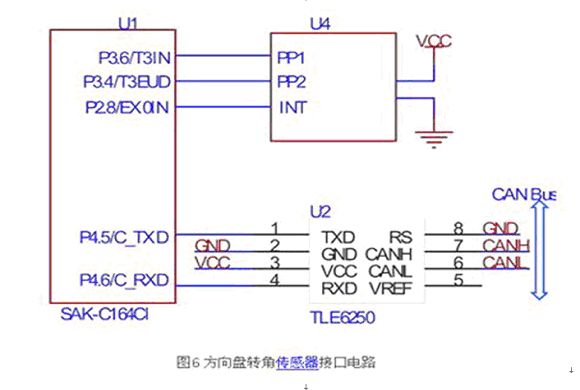 C164CI與方向盤轉角傳感器的接口電路如圖6所示。片內內置增量編碼的正交解碼器,該解碼器使用定時器3的兩個引腳(T3IN、T3EUD)作為正交脈沖的輸入,在正確設置相關寄存器后,定時器3的數據寄存器的值與方向盤轉角成正比,故可方便的計算轉角,本文所使用的方向盤轉角傳感器每一圈對應44個脈沖,設定時器3的數據寄存器為T3,則絕對轉角為。