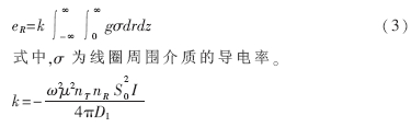 在發(fā)射頻率不高、介質(zhì)導(dǎo)電率較小的條件下,可忽略電磁波傳播效應(yīng)和渦流損耗,用幾何因子理論對(duì)接收線圈中的二次感應(yīng)電動(dòng)勢(shì)進(jìn)行計(jì)算,將同軸于z的兩線圈周?chē)橘|(zhì)中的感應(yīng)渦流分割成以探頭軸心為圓心、半徑為r、距線圈T和R距離分別為ρT和ρR的小單元環(huán)電流。將探頭周?chē)橘|(zhì)看作是均勻無(wú)限介質(zhì),把所有的單元環(huán)感生的電動(dòng)勢(shì)疊加在一起得到: