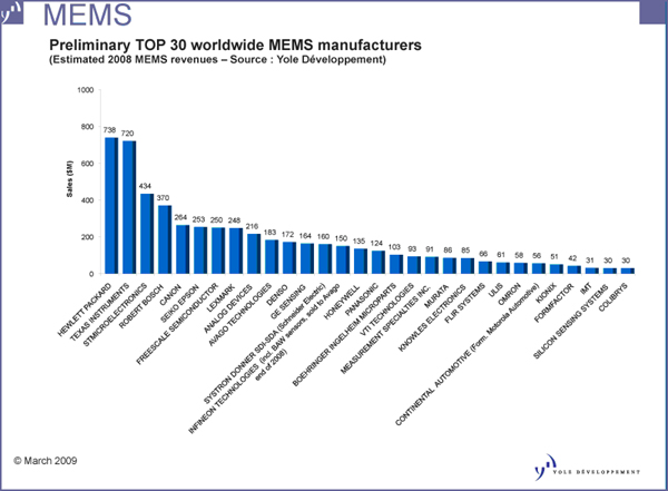 Yole發(fā)布2008年MEMS廠商排名 HP和TI保持領(lǐng)先