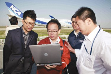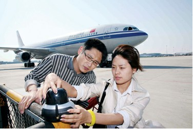圖4:在浦東機(jī)場測試3G信號,電信工作人員仔細(xì)核對