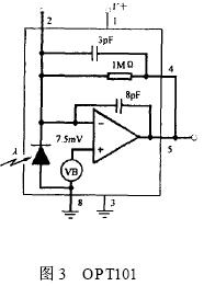 在本文中, 采用一種新型的光敏元件OPT101 , 該元件將感光部件和放大器集成在同一個芯片內部, 這種集成化的設計方式有效地克服了后端運算放大器空載電流輸出對光敏部件輸出電流的影響, 而且芯片輸出的電壓信號可以通過外部的精密電阻進行調節, 有利于芯片適應整體的電路設計, 同時芯片的集成化設計也能夠減小系統的功耗。