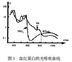 脈搏信號主要由動脈血的充盈引起, 而血液中還原血紅蛋白( Hb) 和氧合血紅蛋白( HbO2 ) 含量變化將造成透光率的變化, 當氧合血紅蛋白和還原血紅蛋白對光的吸收量相等時, 透射光的強度將主要由動脈血管的收縮和舒張引起, 此時能夠比較準確地反映出脈搏信號。圖5 為血紅蛋白的光吸收曲線, 從圖中可以看出, 血液中HbO2 和Hb 對于不同波長光的吸收系數的差異明顯, 而且2 條曲線好幾個不同的交點, 考慮到在805 nm 波長處, 血紅蛋白的光吸收率比較低, 那么透射過手指的光強較大, 有利于光敏器件的接收, 因此發射光源的波長選擇為805 nm。