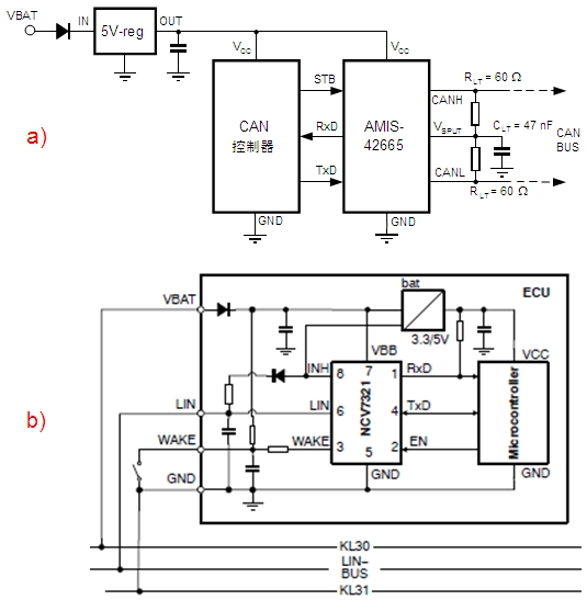 圖3a)及b)分別顯示了基于安森美半導體CAN收發器AMIS-42665及LIN收發器NCV7321的典型電路。值得一提的是,AMIS-42665提供小于的10 μA的極低靜態電流。支持總線喚醒,共模電壓范圍-35 V至+35 V,可以承受額定+/-8 kV的靜電放電(ESD)脈沖。NCV7321則支持-45 V至+45 V的電壓范圍,承受額定5 kV的ESD脈沖。這些器件均提供強大的保護功能。[page]