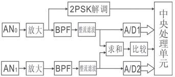 感應無線位置檢測系統電路框圖如圖5所示。當中控室地面局開始發送載波信號時,DCD=1;CPU檢測到DCD后,對2PSK解調輸出檢測,將第1個1作為起始位進行串行數據接收,得到APD位置數據g;在檢測G0的時間段,啟動A/D1和A/D2,從A/D1和A/D2讀出接收線圈0接收的信號幅度A(AN0)和接收線圈1接收的信號幅度A(AN1),將各數據代入公式(5)~(8),可得移動機車位置ADD。