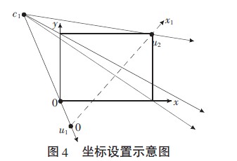 假設虛擬觸摸屏是如圖4所示的矩形區域,以左下角為原點,建立二維坐標平面x、y。左邊攝像頭c1位于虛擬觸摸屏左上角某處,其視角范圍應包含整個矩陣區域,將c1與矩形的4個頂點連接構成攝像頭拍攝各點的光線方向,以經過左下角和右上角頂點的光線方向為腰,c1為頂點作一個等腰三角形,底為虛線所示的(u1,u2)。當手指在矩形區域內任意一點觸摸時,其在攝像頭所拍攝的圖像中均表現為虛線上的一點,手指在二維虛擬觸摸屏上的移動投影到圖像上不會超過這條虛線(u1,u2)范圍,這是算法關注的興趣區域,區域以外的部分不需要處理。因此以u1為原點沿著虛線方向建立一維坐標x1,右邊攝像頭拍攝圖像中的一維坐標x2類似設立。