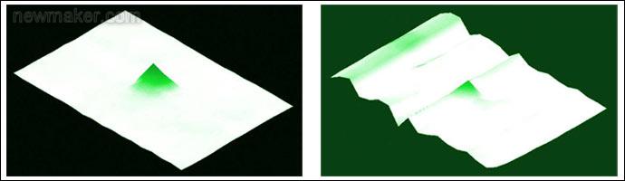 圖4. 4英寸屏上使用2mm導電書寫筆的電容值剖面圖,左側剖面使用高SNR觸摸屏控制器;右側使用低SNR觸摸屏控制器。書寫筆位于綠色錐體頂部;白色平面的高度代表了背景噪聲。信噪比的增加有效降低了背景噪聲幅度,如左圖所示。如果右圖中的書寫筆移到屏幕的左邊,信號將被噪聲淹沒,書寫筆將無法工作。
