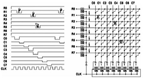 如圖8 所示,8×8 數(shù)字電阻觸摸屏, 基于Altera 解決方案[1]:它采用兩層ITO 分別作為水平的sensing line(觸摸感測線)和垂直的driving line(加電驅(qū)動(dòng)線),driving line 和sensing line 之間的觸點(diǎn)就相當(dāng)于一個(gè)開關(guān),在未接觸時(shí),它們之間是絕緣的,而接觸發(fā)生后,兩者發(fā)生短路,相當(dāng)于開關(guān)閉合。驅(qū)動(dòng)的時(shí)候,其中sensing line 通常由一個(gè)上拉電阻施加高電平,同時(shí)在driving line 上以一定頻率依次在各列中施加負(fù)脈沖電壓,這樣當(dāng)掃描到觸點(diǎn)所在的那一列時(shí),由于觸點(diǎn)開關(guān)閉合,形成直流通路,使得觸點(diǎn)所在行的電壓被拉低,形成一個(gè)負(fù)脈沖,這樣就檢測到了觸點(diǎn)的位置。由于driving line 是依次掃描,所以可以檢測到多個(gè)觸點(diǎn)的位置。