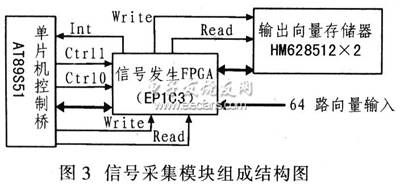 該模塊由單片機控制橋(AT89S51)、測試向量存儲器(靜態存儲器HM628128x2,排列方式為256 Kx8 bit)、信號發生FPGA(Altera公司Cyclone系列PLD器件EP1C3)、通道控制CPLD(Altera公司MAX7000系列PLD器件EPM7128S)及三態選通門陣列(74LS126x16)組成,模塊組成結構如圖2所示。